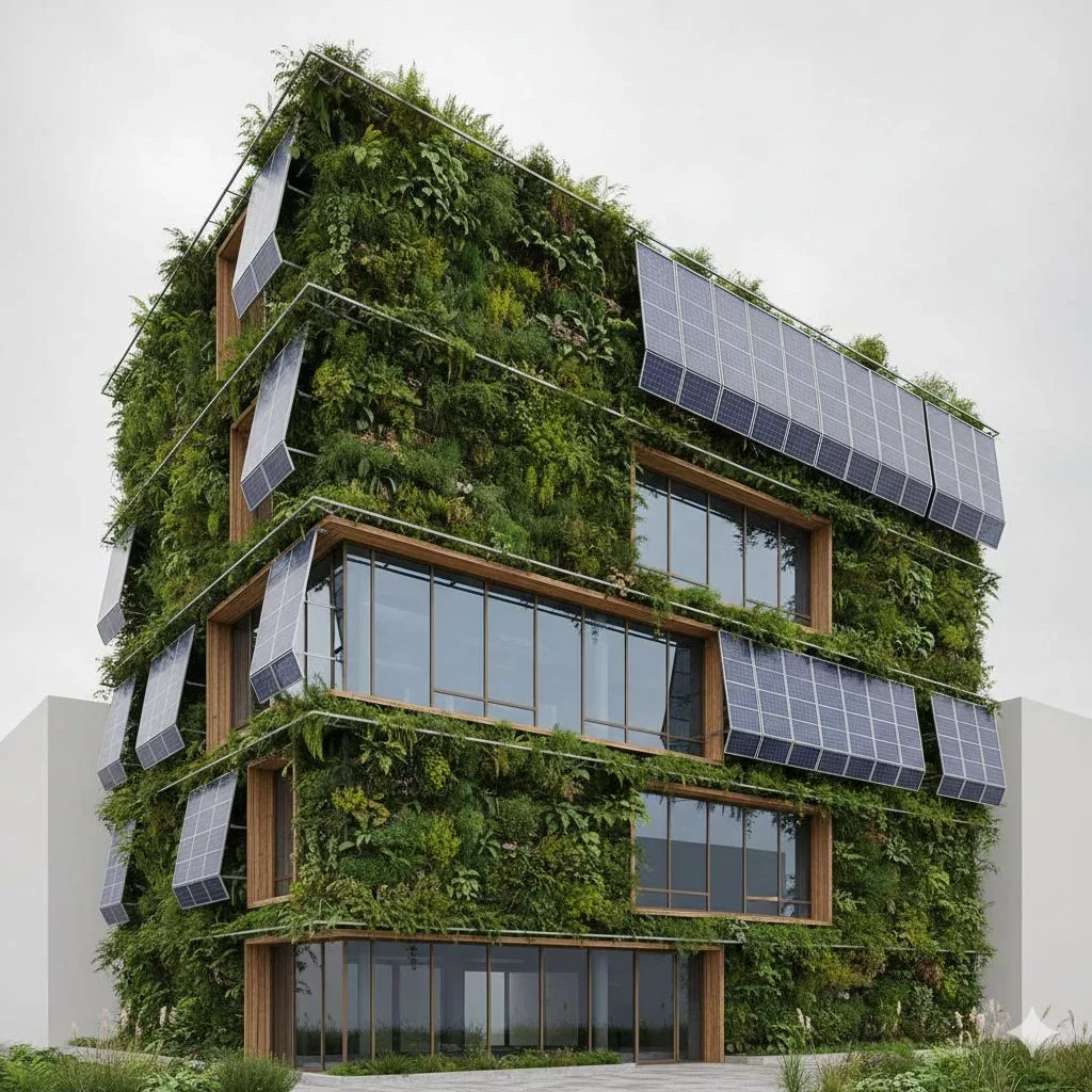 Zero-energy building, green facades with vertical gardens, photovoltaic walls, passive house design, eco-friendly materials, soft overcast lighting, realistic architectural visualization