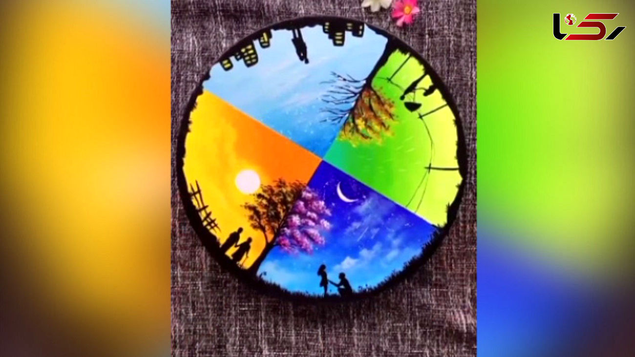 به گزارش رکنا ، یک نقاش خلاق، با استفاده از چسب نواری، بوم دایرهای شکل را به چهار قسمت تقسیم کرد و در هر قسمت، با استفاده از رنگ، نقاشی زیبایی از چهار فصل کشید.