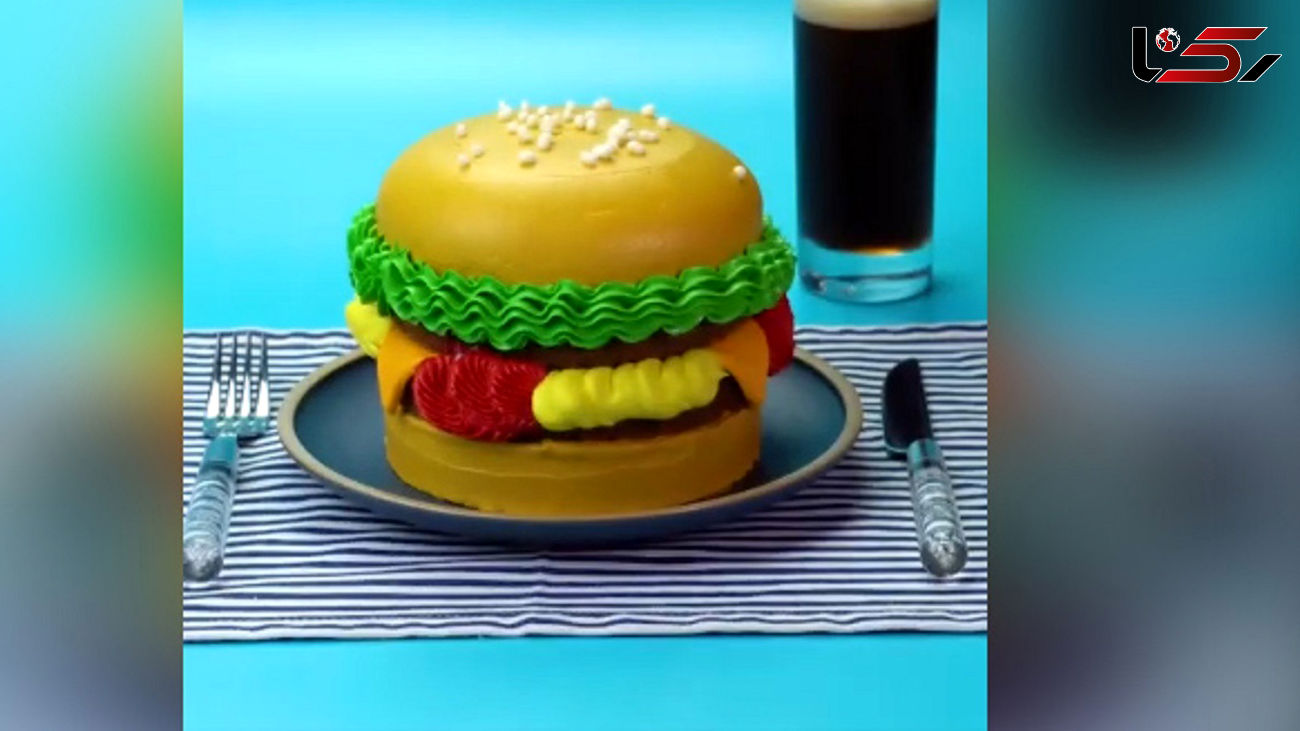 همبرگر از فست فودهای لذیذ است. یک کیک به شکل همبرگر تزئین شده است .