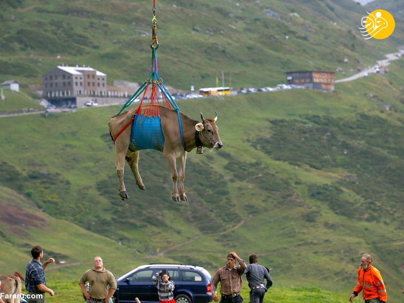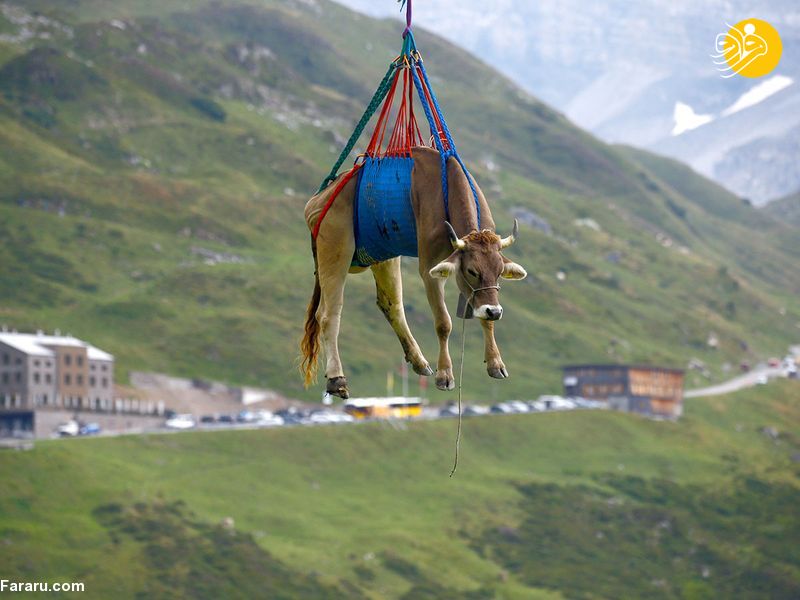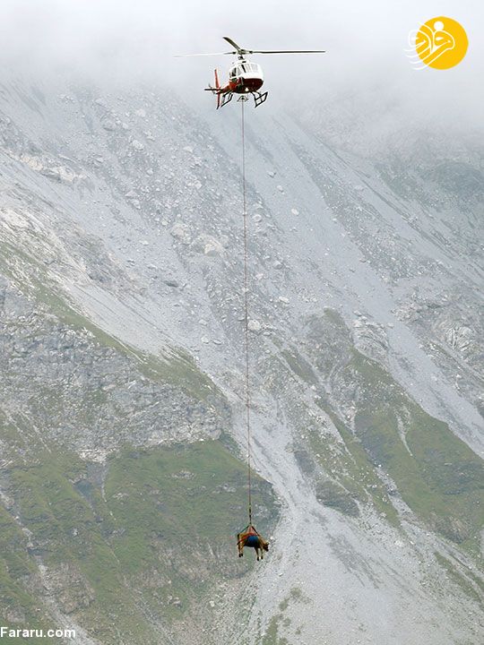 انتقال گاو‌های مجروح با هلیکوپتر به پایین کوه‌های آلپ + عکس