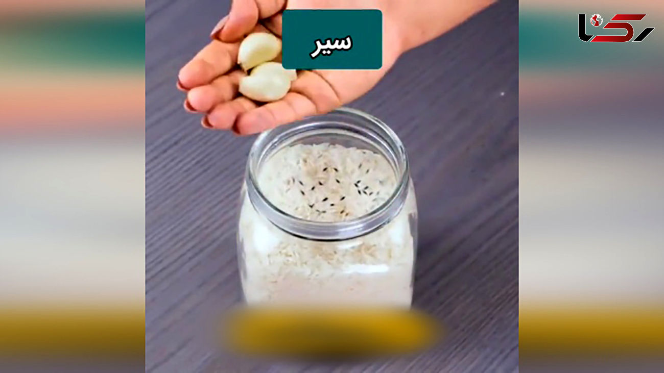 در فیلم زیر با این ترفند آشنا خواهید شد. همانطور که مشاهده می کنید در ظرف حاوی برنج که حشره زده است چند حبه سیر پوست کنده خام قرار دهید و در ظرف را ببندید. پس از مدتی حشرات از بین می روند.