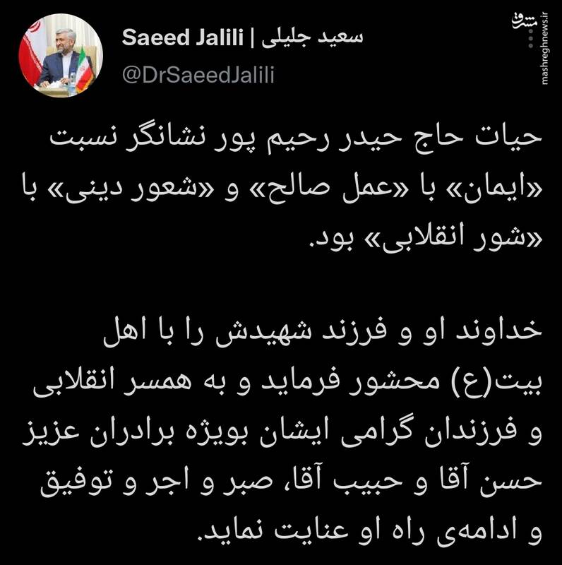 تسلیت جلیلی برای درگذشت حیدر رحیم‌ پور ازغدی + عکس