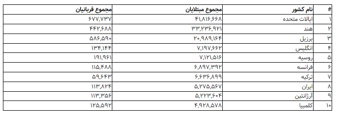بنابر جدول به روز شده در پایگاه اطلاعرسانی "ورلداُمتر"، شمار مبتلایان و قربانیان این بیماری در ۱۰ کشوری که طبق گزارشهای رسمی بالاترین آمارها را تاکنون داشتهاند تا صبح امروز (یکشنبه) به ترتیب به شرح زیر است: