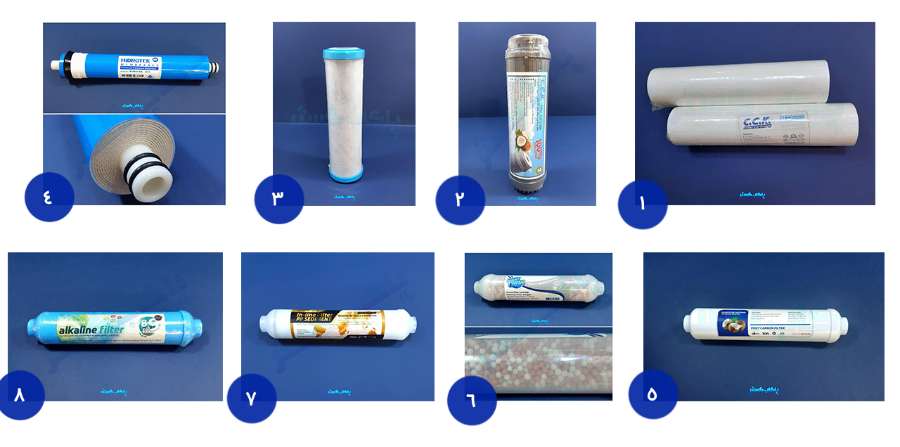 دستگاه تصفیه آب خانگی و نیمه صنعتی دارای فیلترهای متعددی هستند. در واقع بار اصلی فیلتراسیون آب بر دوش فیلترهای تصفیه آب است. به طور کلی دستگاه تصفیه آب با سیستم اسمز معکوس دارای 5 الی 8 فیلتر میباشد. هر یک از این فیلترها دارای وظیفه خاصی هستند. برخی از آنها مواد درشت را از آب حذف میکنند. برخی به حذف بو و طعم ناخوشایند آب میپردازند. برخی از آنها مواد شیمیایی را حذف میکنند.
