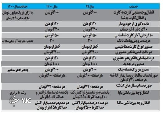 بر این اساس اعلام ماندهکارت و صورتحساب ۱۰ گردش آخر ۲۴۰ تومان، اعلام مانده کارت از خودپرداز ۱۲۰ تومان، اعلام ۱۰ گردش آخر کارت شناسایی ۱۵۰ تومان، صدور انواع کارت مغناطیسی شش هزار تومان، دریافت حضوری قبوض ۲ هزار و ۴۰۰ تومان و غیرحضوری ۱۲۰ تومان، صدور دستهچک به ازای هر برگ ۲۰۰ تومان بههمراه هزینه تمبر، ارائه صورتحساب امسال هر صفحه ۶۰۰ تومان و سالهای گذشته هر صفحه ۷۲۰ تومان است.