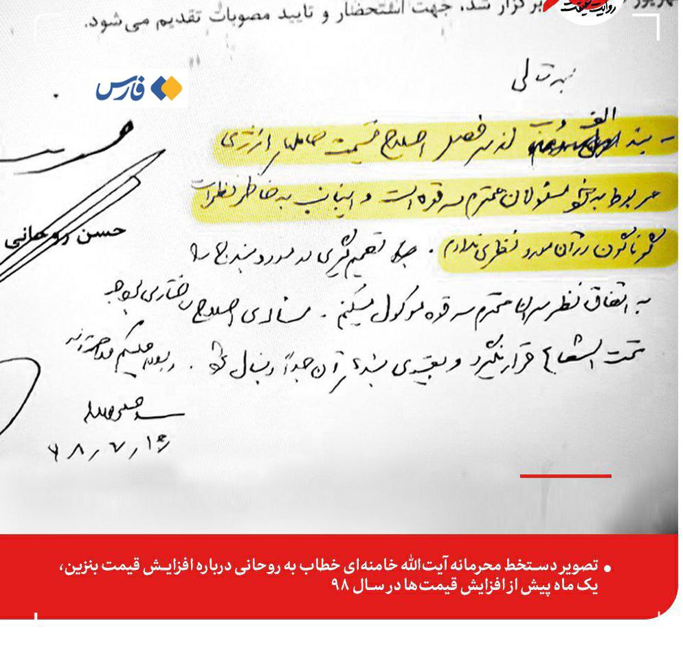 انتشار نخستینبار تصویر دستخط رهبر انقلاب یک ماه پیش از افزایش قیمتها در سال ۹۸: