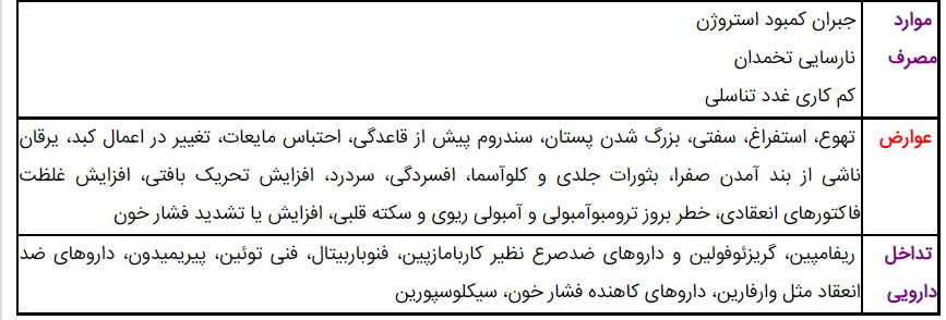 - مصرف طولانی مدت این دارو برای درمان نشانههای یائسگی، ممکن است موجب افزایش خطر بروز بعضی از انواع سرطان شود. پیگیری دقیق و منظم وضعیت بیمار توصیه میشود.