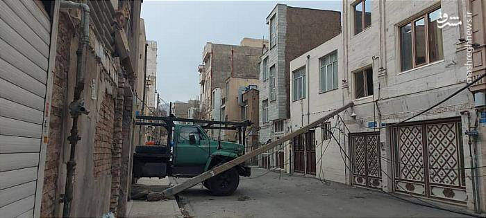 برخورد کامیون با تیر چراغ برق در محله مسکونی + عکس