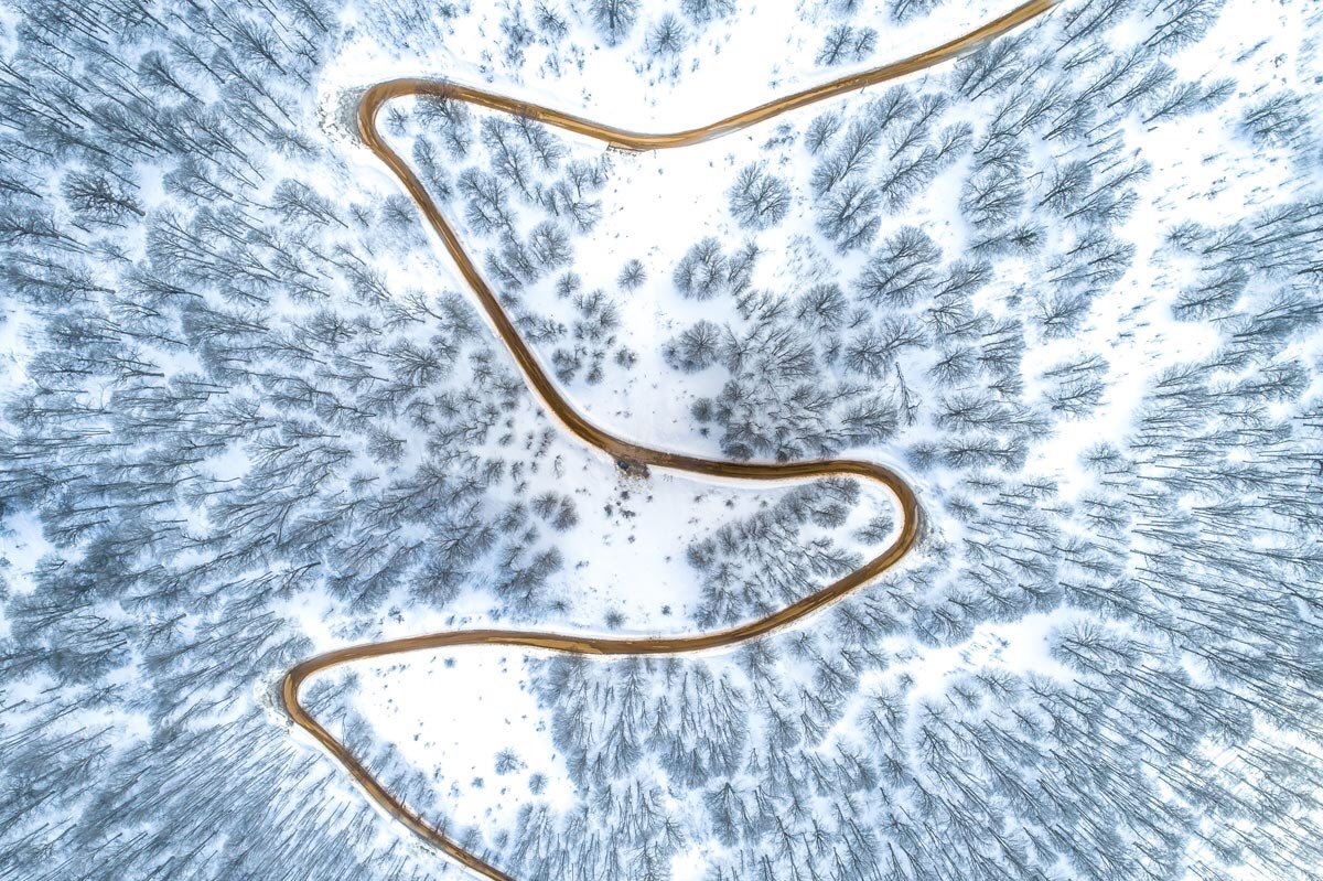 نمای هوایی از جاده زیبا وسط جنگل برفی + عکس