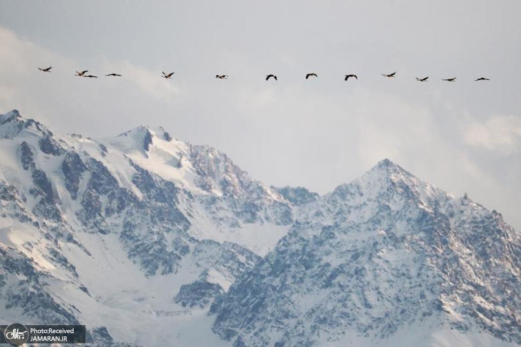 پرواز دسته ای از درناها بر فراز کوه های ایل آلاتائو + عکس