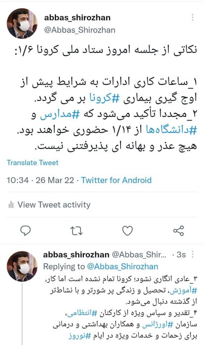 به گزارش بهداشت نیوز، عباس شیراوژن در صفحه شخصی خود در توییتر نوشت: ساعات کاری ادارات به شرایط پیش از اوج گیری بیماری کرونا برمیگردد و همچنین مجددا تأکید میشود که مدارس و دانشگاهها از ۱۴فروردین ۱۴۰۱ حضوری خواهند بود و هیچ عذر و بهانهای پذیرفتنی نیست.