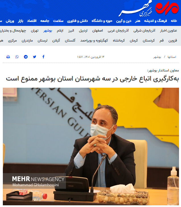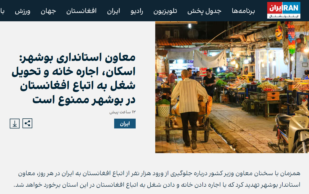 به گزارش بهداشت نیوز، پس از مصاحبه محمد تقی ایرانی، معاون سیاسی، امنیتی و اجتماعی استانداری بوشهر درخصوص حضور غیر مجاز اتباع افغانی در استان بوشهر برخی از رسانههای فارسی زبان خارج از کشور سعی کردند از این فرصت استفاده کرده و انتشار این خبر را با چاشنی نفرت پراکنی میان اقوام ایرانی و افغان ترکیب کنند.