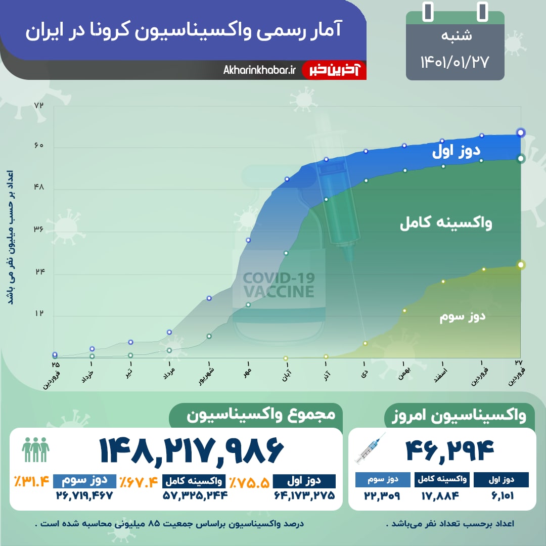اینفوگرافی؛ آخرین آمار از وضعیت واکسیناسیون کرونا در کشور تا 27 فروردین 1401