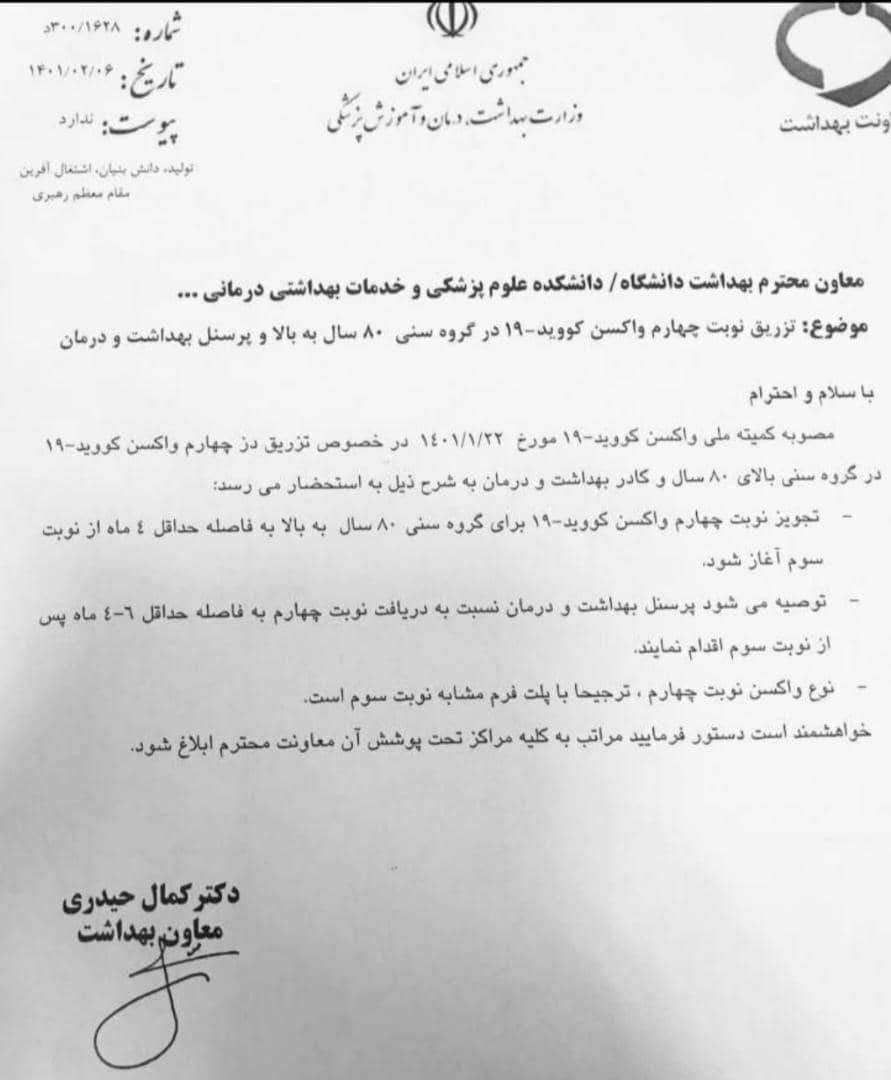 به گزارش بهداشت نیوز ،کمال حیدری، معاون بهداشت وزارت بهداشت در ابلاغیه به مراکز بهداشتی عنوان کرد: تجویز نوبت چهارم واکسن کووید ۱۹ برای گروه سنی ۸۰ سال به بالا به فاصله حداقل ۴ ماه از نوبت سوم آغاز شود.