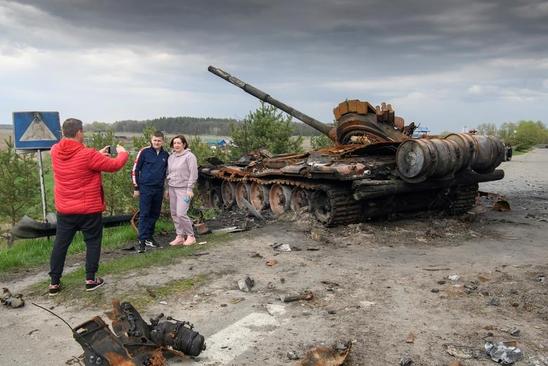 عکس یادگاری اوکراینی ها در کنار تانک های منهدم شده روسیه + عکس