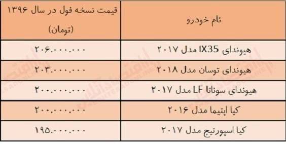 هیوندای IX۳۵، هیوندای توسان، هیوندای سوناتا LF، کیا اپتیما و کیا اسپورتیج از خودروهایی هستند که با بودجه ای حدود ۲۰۰ میلیون می توانستید در نسخه فول آپشن در سال ۱۳۹۶ خریداری کنید.