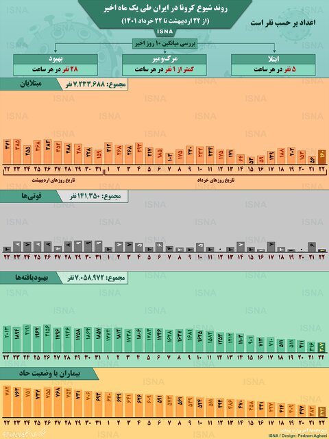 به گزارش بهداشت نیوز ،طبق اعلام وزارت بهداشت، کرونا تا ظهر یکشنبه (۲۲ خرداد ۱۴۰۱) هفت میلیون و ۲۳۳ هزار و ۶۸۸ نفر را در ایران به طور قطعی مبتلا کرده و در مجموع تا این روز ۱۴۱ هزار و ۳۵۰ نفر را به کام مرگ کشانده است. از سوی دیگر، هفت میلیون و ۵۸ هزار و ۹۷۲ نفر در ایران تاکنون بهبود یافتهاند. آمارهای وزارت بهداشت نشان میدهد که طی ۱۰ روز اخیر (۱۳ تا ۲۲ خرداد ۱۴۰۱) به طور متوسط هر ساعت پنج نفر در ایران مبتلا و کمتر از یک نفر قربانی کرونا شده و در هر ساعت ۲۸ نفر نیز بهبود یافتهاند. در این اینفوگرافیک روند شیوع کرونا در ایران طی یک ماه اخیر (از ۲۲ اردیبهشت تا ۲۲ خرداد ۱۴۰۱) را مشاهده میکنید.
