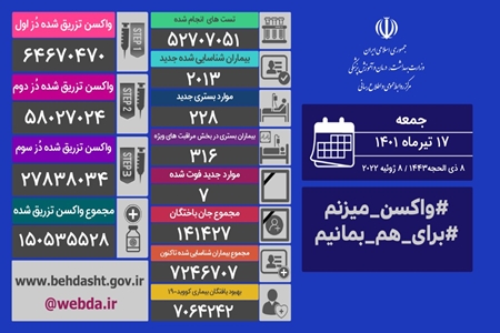 از دیروز تا امروز ۱۷ تیرماه ۱۴۰۱ و بر اساس معیارهای قطعی تشخیصی، ۲۰۱۳ بیمار جدید مبتلا به کووید۱۹ در کشور شناسایی و ۲۲۸ نفر از آنها بستری شدند.