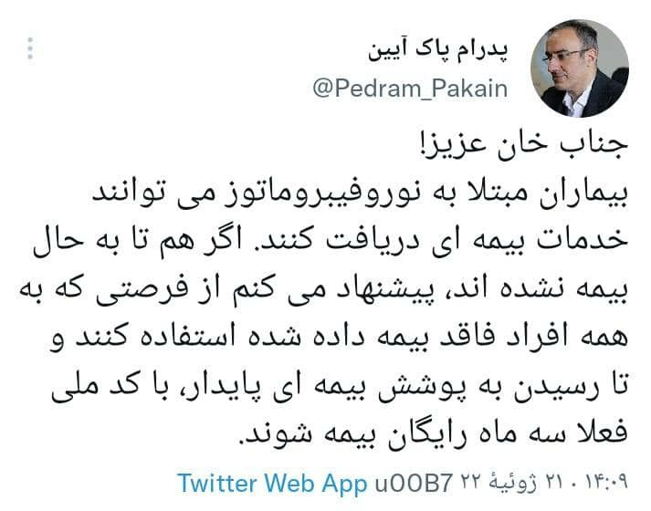 پدرام پاک آیین، سخنگوی وزارت بهداشت در پاسخ «جناب خان» شخصیت عروسکی مشهور برنامه«خندوانه» که خواستار پوشش بیمه ای بیماران مبتلا به «نورو فیبرو ماتوز» شده بود، در حساب کاربری خود در توییتر نوشت: