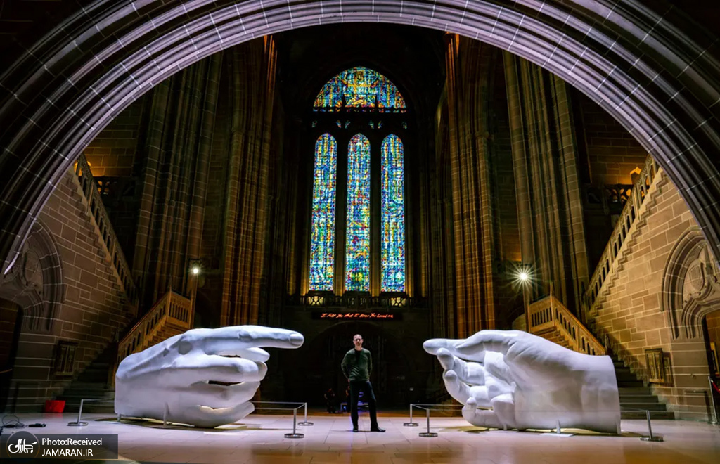 پیتر واکر، در کنار اثر خود از نمایشگاه انسان بودن + عکس