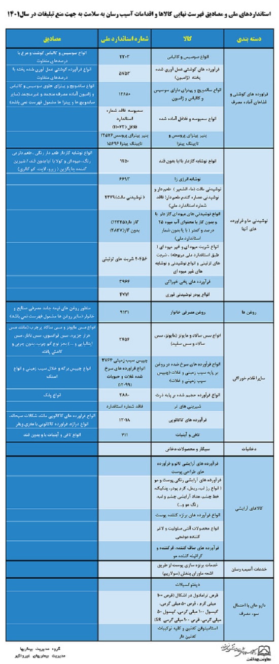 وی افزود: فرآورده های گوشتی و غذاهای آماده مصرف، نوشیدنی و فرآورده های آن ، کالاهای آرایشی، روغن های نیمه جامد، دخانیات، داروهای با احتمال سوء مصرف و خدمات آسیب رسان از جمله این موارد می باشد.