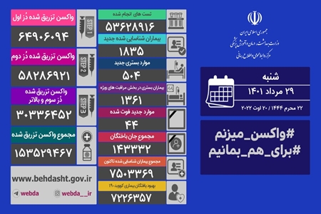 از دیروز تا امروز ۲۹ مردادماه ۱۴۰۱ و بر اساس معیارهای قطعی تشخیصی، ۱۸۳۵ بیمار جدید مبتلا به کووید۱۹ در کشور شناسایی و ۵۰۴ نفر از آنها بستری شدند.