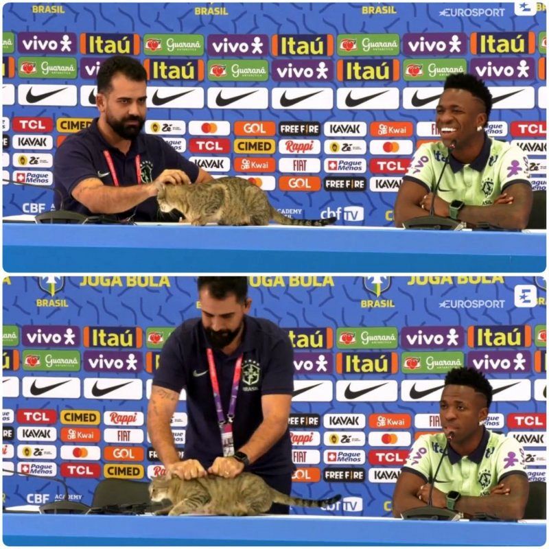 در این زمان، افسر مطبوعاتی تیم ملی برزیل یا همان مدیررسانه ای، در حالیکه کنار وینیسیوس نشسته بود، به طرز عجیبی و با چنگ زدن به بدن این گربه، او را از روی میز نشست خبری به پایین پرتاب کرد.