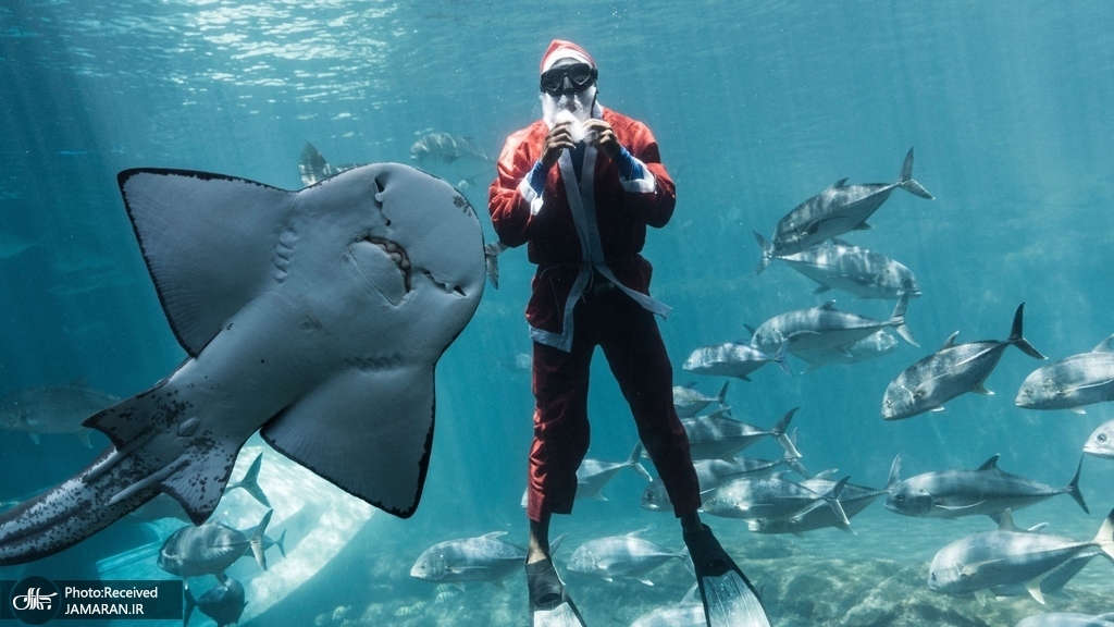 تصویر غواصی با لباس بابانوئل در کنار سفره ماهی + عکس