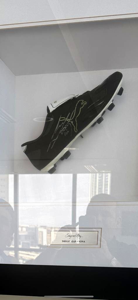 طرفداری: کفش مارادونای افسانه ای روی دیوار خانه حشمت مهاجراین دیده می شود.