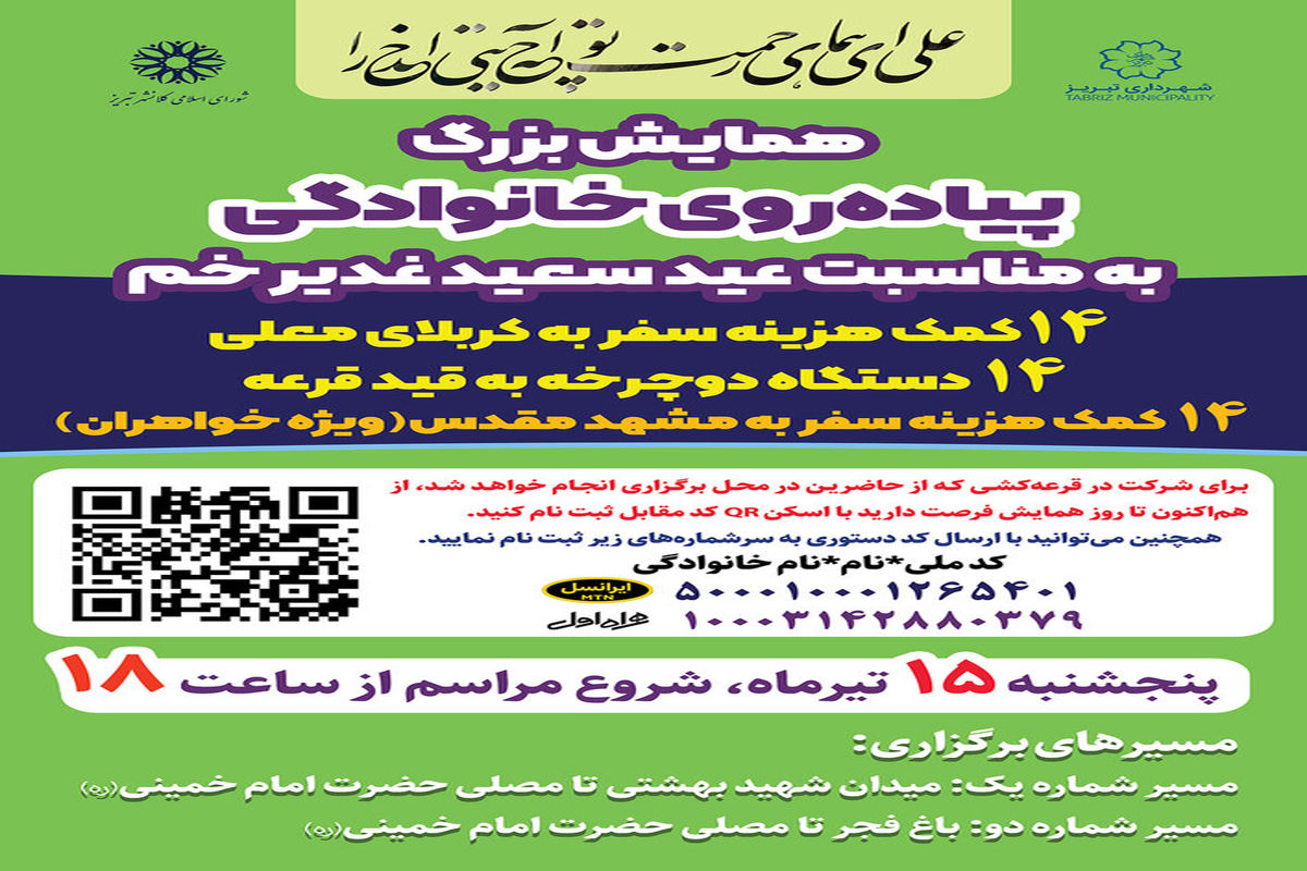 به گزارش خبرگزاری برنا در آذربایجان شرقی، شهرداری تبریز با پیشبینی برنامههایی متنوع، در تکاپوی گرامیداشت و برگزاری شکوهمند بزرگترین عید مسلمانان و شیعیان برآمده است که در این راستا و برای نخستین بار به مناسبت گرامیداشت عید بزرگ غدیر خم برنامه پیادهروی خانوادگی در دو مسیر و با برنامه های متنوع و مختلف پیش بینی شده است.
