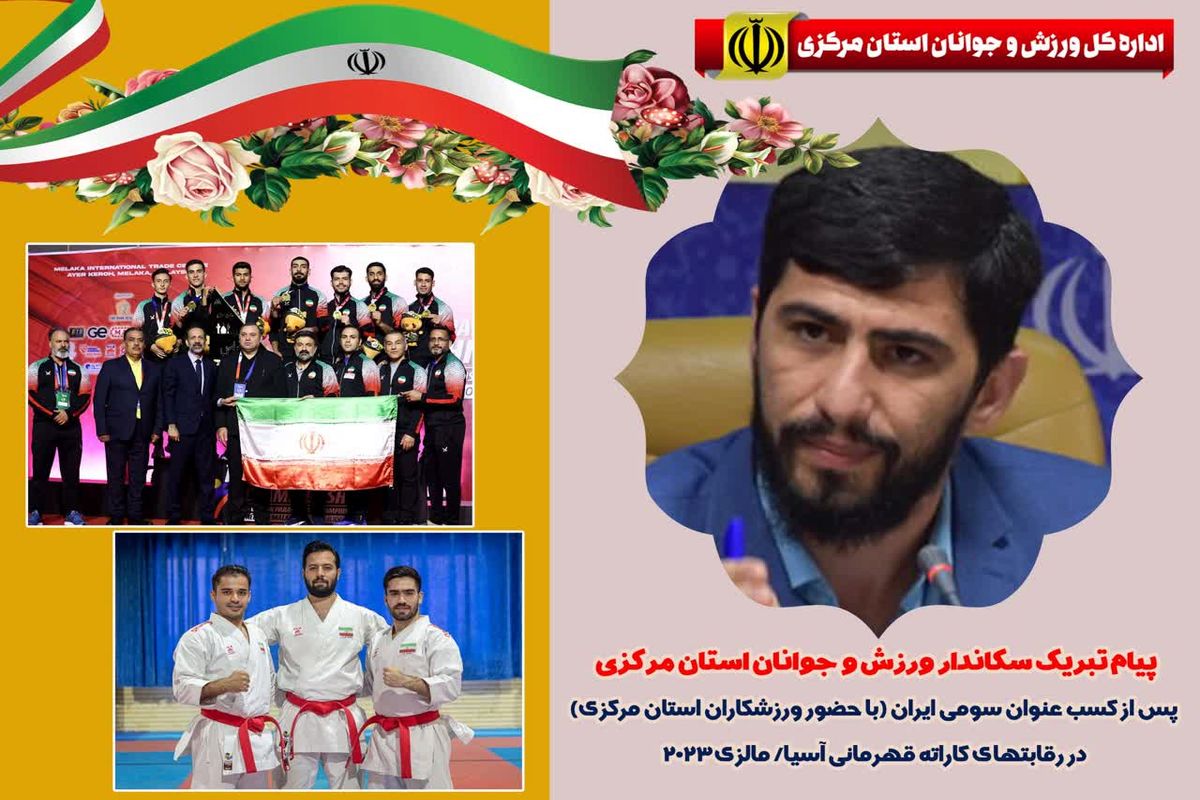 درخشش مدال آوران کاراتهکاهای ملی پوش استان مرکزی با کسب مدال برنز کاتای انفردای ابوالفضل شهرجردی ، برنز کاتای تیمی علی زند،محمدفرازمهر ، ابوالفضل شهرجردی و مدال طلای کومیته تیمی صالح اباذری در این رویداد قهرمانی آسیا را به این افتخارآفرینان، کادر فنی ، سرپرستان، مسئولان فدراسیون و جامعه ورزش کشور و استان مرکزی تبریک گفته و روزهای پرافتخارتر و کسب مدال های رنگارنگ را برای تمامی ورزشکاران ایران اسلامی آرزومندم.