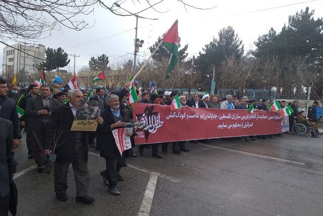نمازگزاران نماز جمعه بجنورد بعد از پایان نماز در محکومیت جنایتهای رژیم اسرائیل مسیر مصلی تا میدان بازرگانی را راهپیمایی کردند.