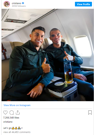 در این تصویر در کنار په په در هوایپیما، جلوی رونالدو یک بطری نوشیدنی با آرم تیم ملی پرتغال قرار دارد. برخی هواداران معتقدند این بطری حاوی نوشیدنی انرژی زاده و برخی دیگر پا فراتر گذاشته و محتویات آن را نوشیدنی های الکلی دانسته اند. به هر حال به نظر می رسد کل کل کریستیانو رونالدو با کوکاکولا تمامی ندارد و او حاضر به مصرف هر شکل نوشیدنی به جز این مدل نوشابه است.
