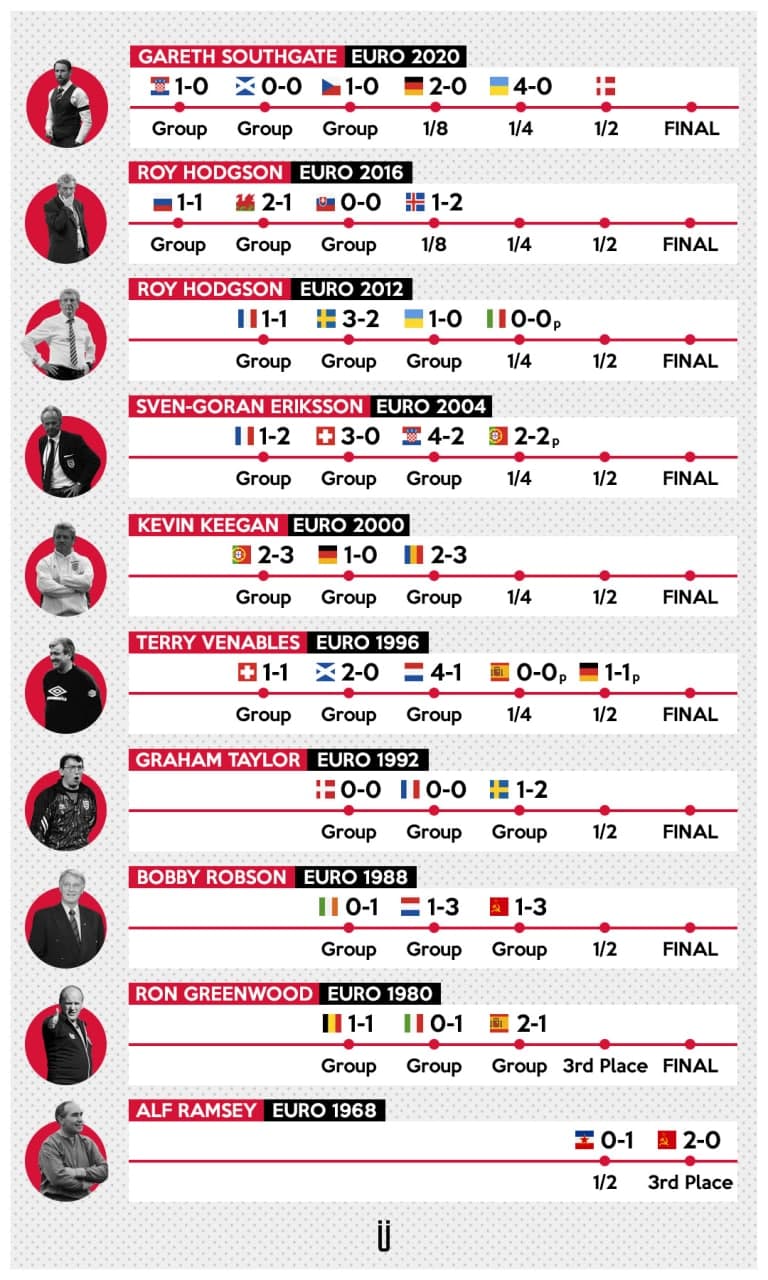 در صورتی که سرمربی 50 انگلیس بتواند تیمش را در برابر دانمارک پیروز از زمین خارج کرده و فینالیست کند، موفق به انجام کاری خواهد شد که سرمربیان بزرگی در طول تاریخ فوتبال انگلیس موفق به انجام آن نشده اند.