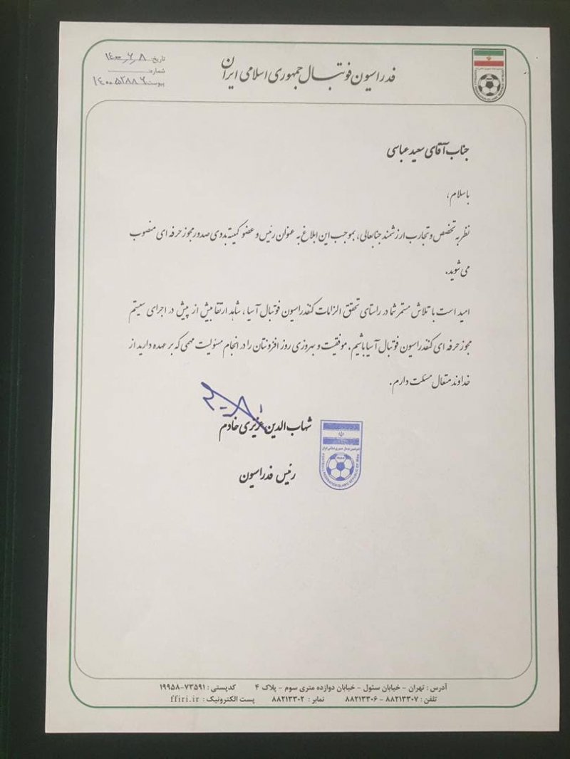 گفتنی است؛ حسن کامرانیفر، سرپرست دبیرکلی فدراسیون فوتبال حکم عباسی را به وی ابلاغ کرد.