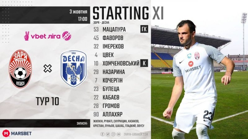 به گزارش "ورزش سه"، در یکی از مسابقات هفته دهم لیگ برتر اوکراین، تیم فوتبال زوریا لوهانسک با بهره‌مندی از اللهیار صیادمنش و شهاب زاهدی در فهرست نفرات خود، از ساعت ۱۷:۳۰ امروز(به وقت ایران) در ورزشگاه اسلاووتچی آرنا به مصاف تیم رده هفتمی دِسنا می‌رود.
