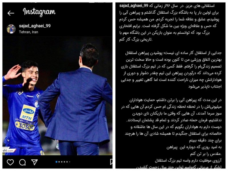 سجاد آقایی بازیکن جوان و 22 ساله استقلال با انتشار پستی در اینستاگرام، از جمع آبی های پایتخت جدا شد.