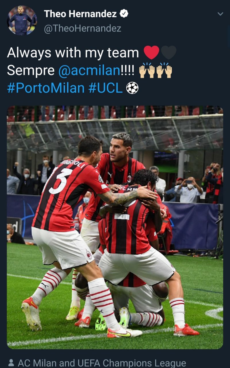 تئو هرناندز با وجود غیبت در مسابقه امشب یک پیام انگیزشی را برای هم تیمی های خود ارسال کرده است. مدافع فرانسوی و یکی از بهترین های میلان در توییتر خود نوشت: "همیشه در کنار تیم، همیشه میلان."