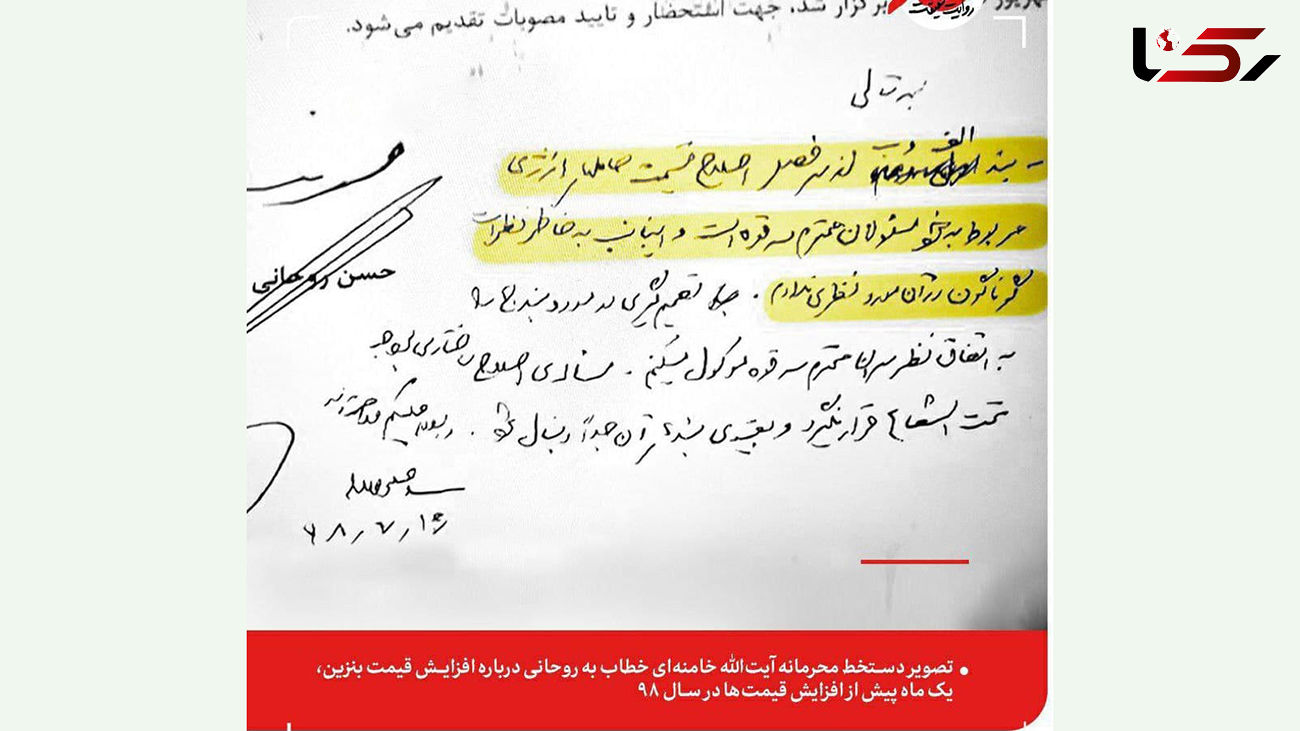 رکنا : دستخط حضرت آیتالله خامنهای خطاب به روحانی درباره افزایش قیمت بنزین منتشر شد.