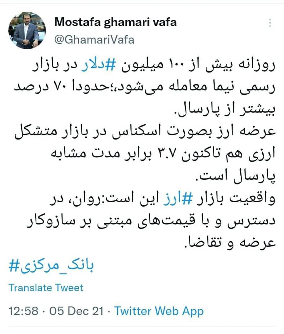 مصطفی قمری وفا: روزانه بیش از ۱۰۰ میلیون دلار در بازار رسمی نیما معامله می شود، حدودا ۷۰ درصد بیشتر از پارسال. عرضه ارز به صورت اسکناس در بازار متشکل ارزی هم تاکنون ۳.۷ برابر مدت مشابه پارسال است.