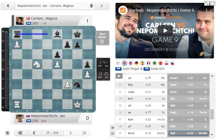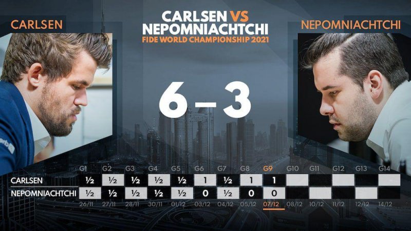 حالا کارلسن برای رسیدن به قهرمانی از پنج دیدار باقی مانده تنها به یک و نیم امتیاز احتیاج دارد تا باز هم از قهرمانی خود دفاع کند.