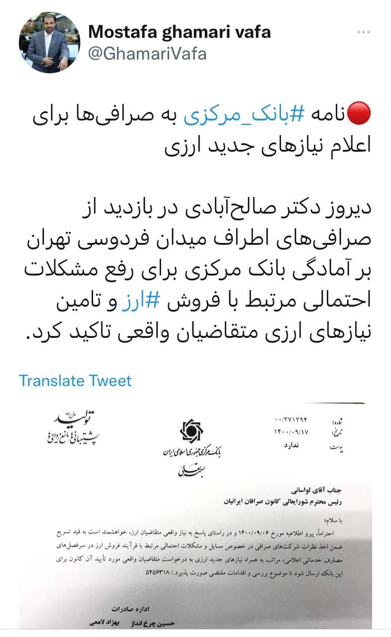 دیروز دکتر صالح آبادی در بازدید از صرافی های اطراف میدان فردوسی تهران بر آمادگی بانک مرکزی برای رفع مشکلات احتمالی مرتبط با فروش ارز و تامین نیازهای ارزی متقاضیان واقعی تاکید کرد.