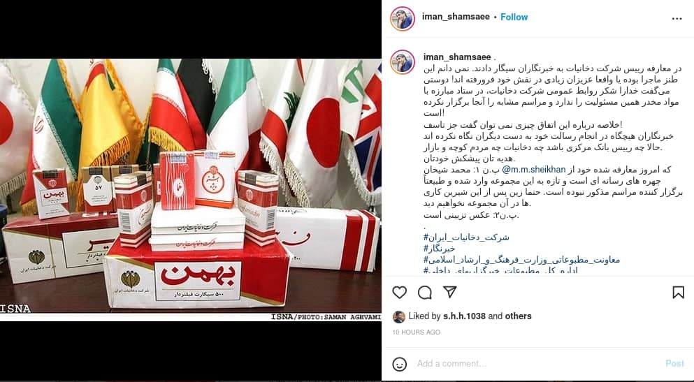 در معارفه رییس شرکت دخانیات به خبرنگاران سیگار دادند. نمی دانم این طنز ماجرا بوده یا واقعا عزیزان زیادی در نقش خود فرورفته اند! دوستی میگفت خدارا شکر روابط عمومی شرکت دخانیات، در ستاد مبارزه با مواد مخدر همین مسئولیت را ندارد و مراسم مشابه را آنجا برگزار نکرده است!