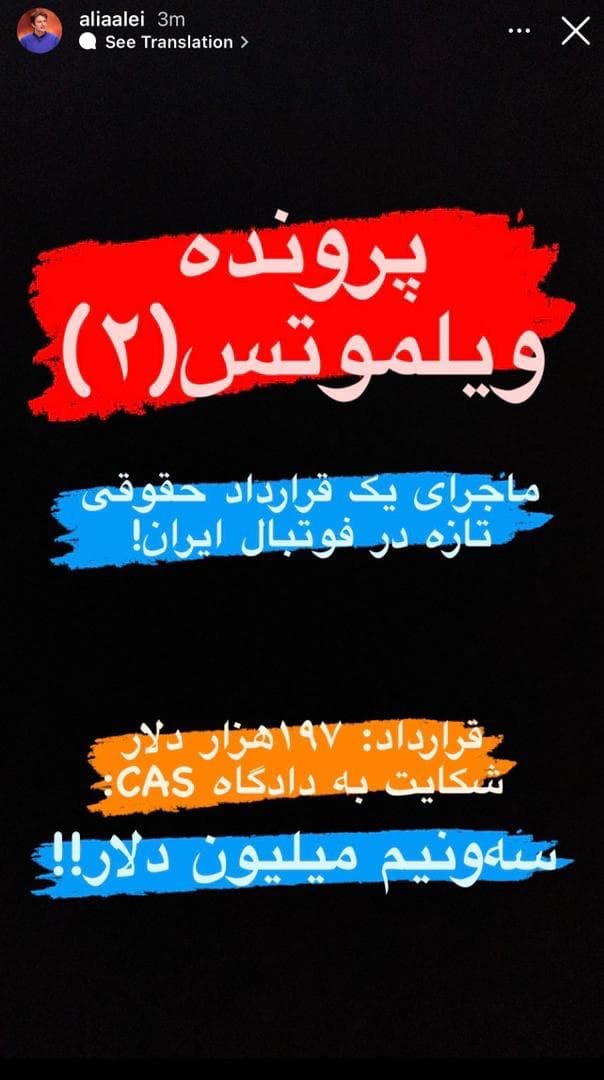 حالا و در شرایطی که هنوز رای نهایی در رابطه با پرونده ویلموتس صادر نشده، علی عالی دستیار عزیزی خادم با انتشار یک استوری از ظهور یک پرونده دیگر خبر داده است؛ پروندهای که طبق گفته دستیار عزیزی خادم قراردادی 175 هزار دلاری بوده که در شکایت به دادگاه عالی ورزش (CAS) به سه و نیم میلیون دلار افزایش پیدا کرده است.