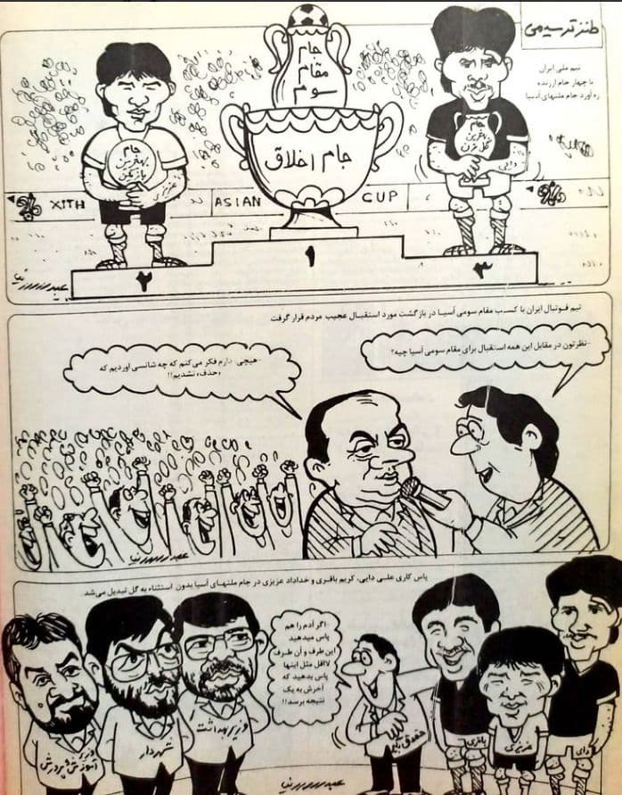 روزنامه کیهان ورزشی در دیماه سال 1375با انتشار صفحه ای با کاریکاتورهای خدادادعزیزی ،کریم باقری و علی دایی به همراه داریوش مصطفوی رئیس وقت فدراسیون نگاهی طنر به درخشش سه ستاره ایران در این رقابت ها داشت.