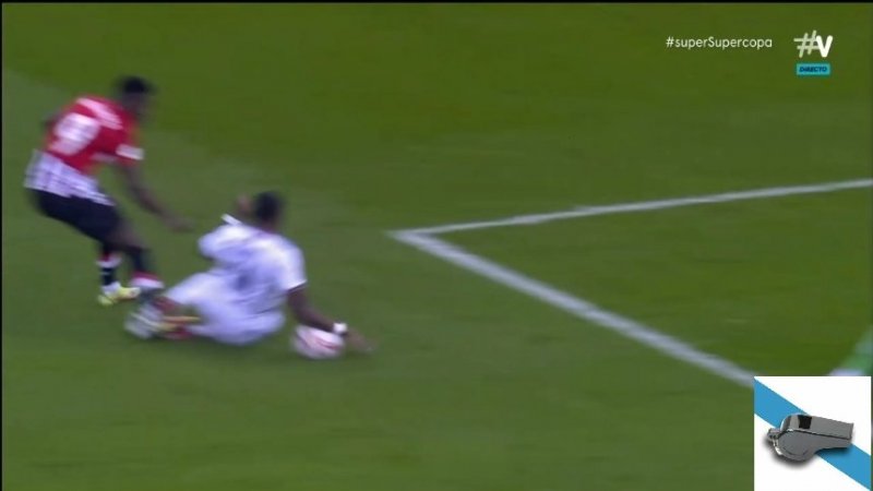 اما در اواسط نیمه اول بود که در یک صحنه ضربه مونیان در محوط جریمه رئال مادرید به دست داوید آلابا، مدافع اتریشی این تیم برخورد کرد و بازیکنان بیلبائو اعتقاد به اعلام یک پنالتی به سود تیم خود داشتند. البته داوید آلابا هنگام تکل زدن زمین خورد و در آن لحظه بود که توپ به دست مدافع جدید رئال مادرید برخورد کرد. البته داور حتی نیازی به بازبینی صحنه نیز ندید و حکم به ادامه مسابقه داد.