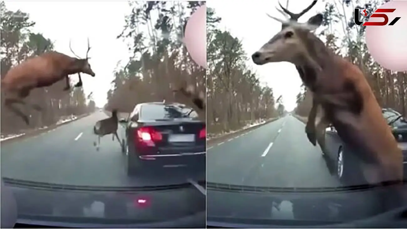 فیلم عجیب از هجوم ناگهانی گوزن‌ها به اتوبان / راننده ها شگفت زده شدند