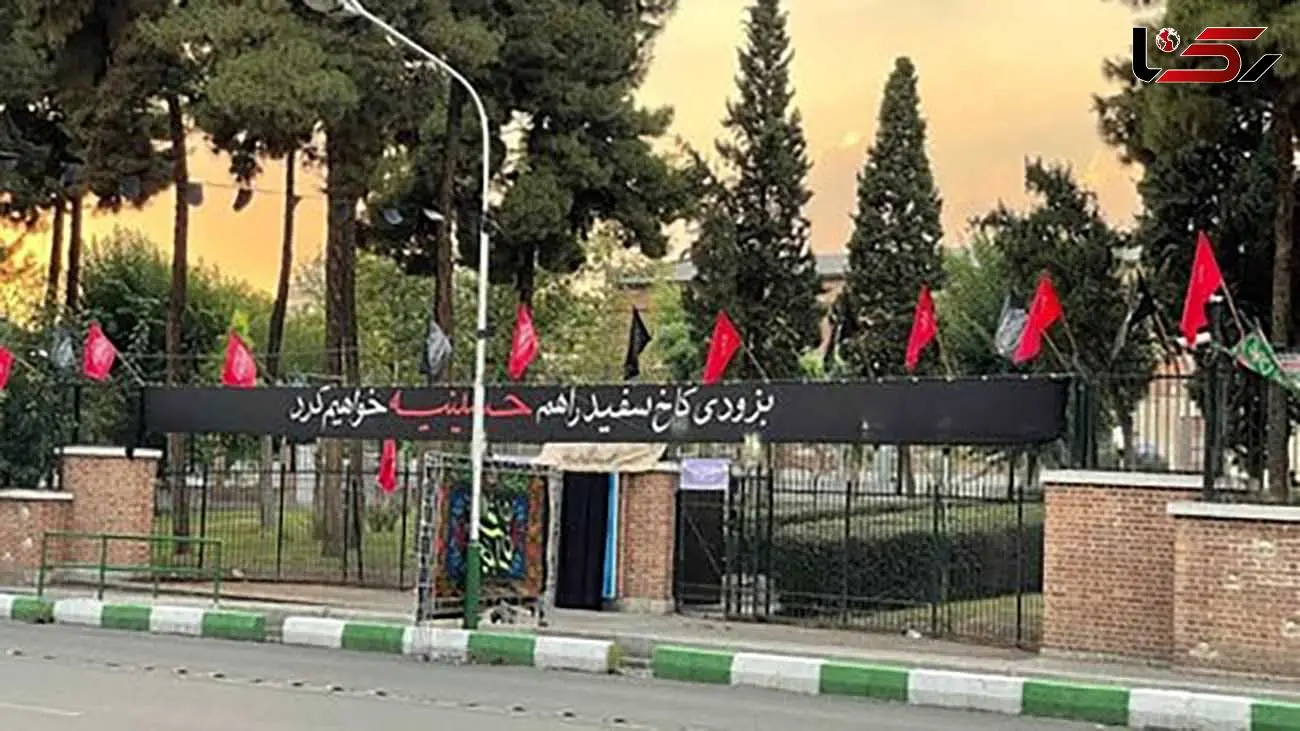 ساختمان سفارت امریکا در تهران که در آبان ۵۸ تعطیل شد، به مناسبت ماه محرم ، سیاه پوش شده و بر روی بنر بزرگی نوشته شده: "به زودی کاخ سفید را هم حسینیه خواهیم کرد".