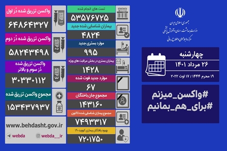 "تا کنون ۶۴ میلیون و ۸۶۴ هزار و ۳۲۷ نفر دُز اول، ۵۸ میلیون و ۲۴۳ هزار و ۴۹۸ نفر دُز دوم و ۳۰ میلیون و ۳۳۰ هزار و ۱۱۲ نفر، دُز سوم و بالاتر واکسن کرونا را تزریق کرده اند و مجموع واکسن های تزریق شده در کشور به ۱۵۳ میلیون و ۴۳۷ هزار و ۹۳۷ دُز رسید.