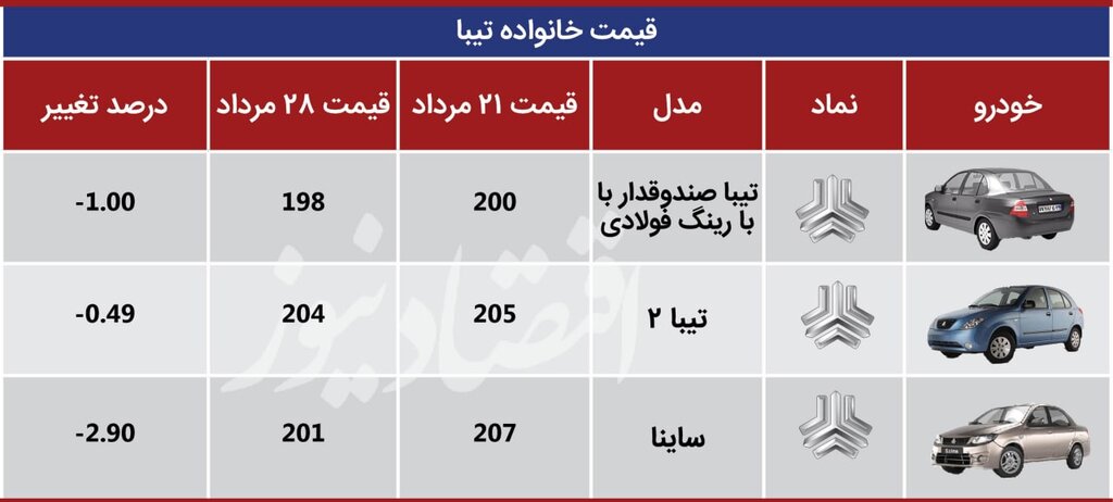 از سوی دیگر در میان خانواده تیبا هم امروز «تیبا صندوقدار» امروز در بازار ۱۹۸ میلیون تومان قیمت گذاری شد و «تیبا ۲ » هم در بازار ۲۰۴ میلیون تومان قیمت خورد.